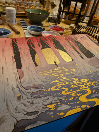 Reinterpretation of a 15 year old painting. Symbolism The golden Moon - eternal female consciousness "Sophia" The night - emptiness - the emptiness who creates. The Stars and golden lights in the foreground - Single consciousness of single souls. The Stream of gold - All consciosness floats back to the source and unites again with the eternal radiant source that is HER.